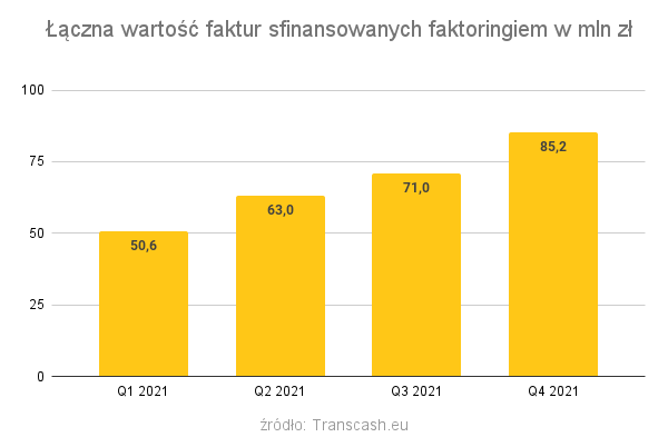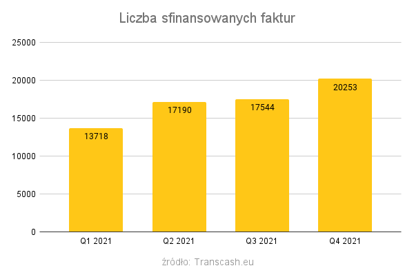 Pierwszy kwartał 2021 roku nie zapowiadał spektakularnych wzrostów - 13718 faktur na łączną kwotę 50,6 mln zł to wynik porównywalny do pierwszego kwartału 2020 roku. W kolejnych kwartałach Transcash.eu odnotował stabilne wzrosty - finansując w drugim kwartale 17190 faktur na łączną kwotę 63 mln zł oraz 17544 faktur w Q3 o łącznej wartości 71 mln zł. Czwarty kwartał 2021 roku zakończył się wynikiem 20253 sfinansowanych faktur o łącznej wartości 85,2 mln zł.