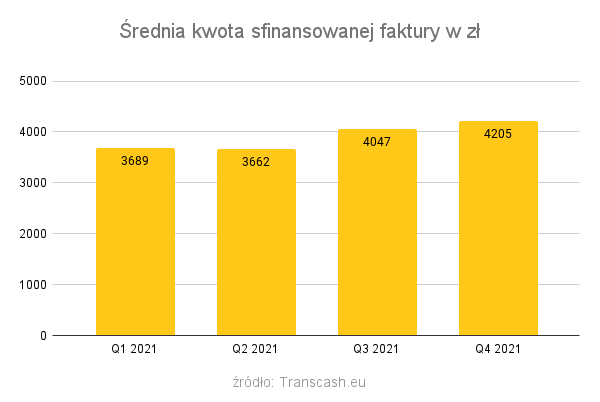 Średnia wartość sfinansowanej faktury w 2021 roku wyniosła 3926 zł. Przy czym od trzeciego kwartału widoczny jest wzrost średniej kwoty faktury. To wynik z jednej strony rosnących kosztów przewoźników - wzrost ceny paliwa, braki kadrowe, które wymuszają na firmach przewozowych zwiększenie wynagrodzeń kierowców, z drugiej zaś strony zwiększone zapotrzebowanie na transport, szczególnie w 4 kwartale przekłada się na wzrost stawek za fracht. Średnia kwota sfinansowanej faktury w czwartym kwartale 2021 roku wzrosła o 516 zł w stosunku do pierwszego kwartału, co stanowi wzrost o 14%.