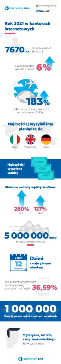 Rok 2021 był rekordowy w serwisach wymiany walut należących do Currency One. InternetowyKantor.pl i Walutomat zanotowały rekord obrotów, odnotowując dwucyfrowy wzrost rok do roku. Na ten imponujący wynik Currency One wpływ miały przede wszystkim sytuacja na rynkach, spowodowana dużymi wahaniami kursów związanymi m.in. z pandemią, ale również rozwój samych serwisów i nowe usługi wprowadzone dla klientów.