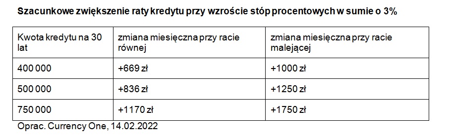 Szacunkowe zwiększenie raty kredytu przy wzroście stóp procentowych w sumie o 3%