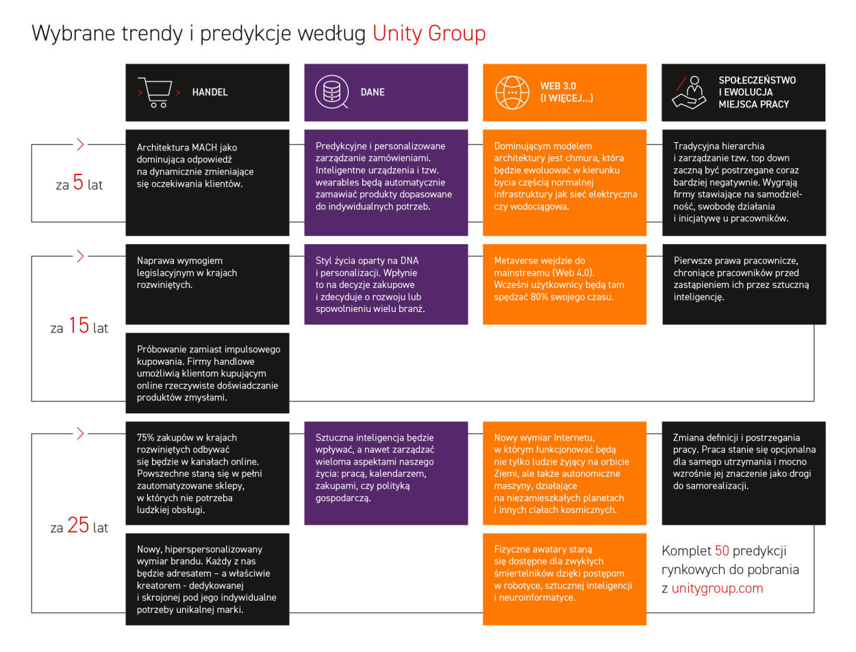 W tych obszarach specjaliści Unity Group przewidują znaczące zmiany. Na przykład w dziedzinie handlu już teraz liczba punktów interakcji z klientem w kanale cyfrowym ciągle rośnie, a za pięć lat ten trend spowoduje, iż organizacje będą musiały przestawić się na model architektury, który obsłuży nie tylko już istniejące, ale również wszystkie przyszłe kanały. Architektura MACH (Microservices, API, Cloud, Headless) stanie się dominującą wśród firm sprzedających w modelu omnichannel. Za 15 lat sprzedający, chcąc przekonać klienta do zakupu, umożliwią maksymalne testowanie w kanale online. Będziemy mogli rzeczywiście doświadczać produktów zmysłami (zapach, smak, wrażenia dotykowe). Upowszechnią się technologie internet-senses.