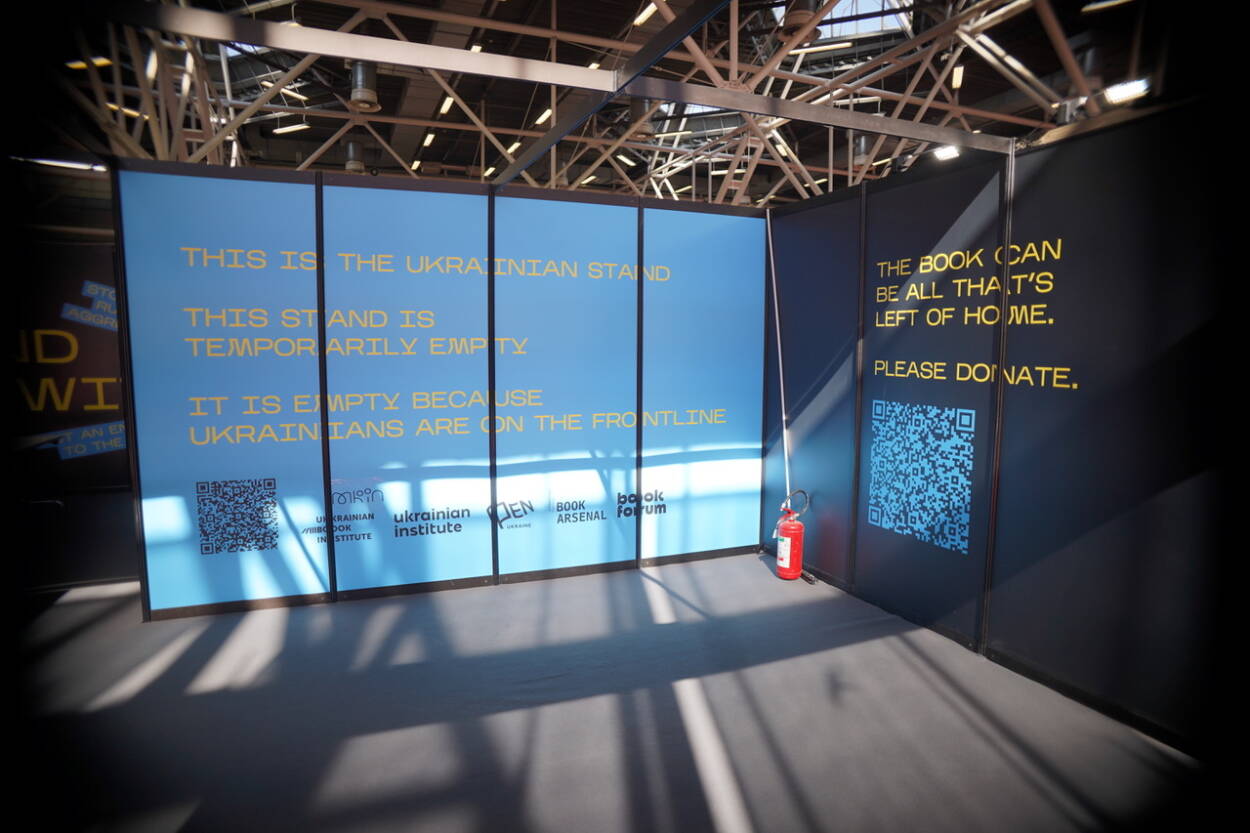 Puste stoisko Ukrainy na Międzynarodowych Targach Książki dla Dzieci w Bolonii