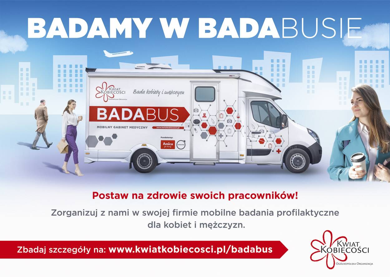Ogólnopolska Organizacja Kwiat Kobiecości ruszyła z projektem BADABUS - innowacyjnym mobilnym gabinetem medycznym. Bus dociera do każdego zakątka Polski i umożliwia szybką diagnostykę w kierunku raka szyjki macicy, raka jajnika i raka prostaty wszędzie tam, gdzie dostęp do badań jest utrudniony i wymaga wielomiesięcznych oczekiwań. BADABUSa mogą wynająć prywatne firmy czy instytucje, które chcą zainwestować w zdrowie pracowników lub klientów.