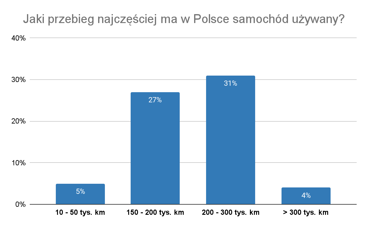 Według danych serwisu autobaza.pl na polskim rynku wtórnym prym wiodą samochody o przebiegu w przedziale między 200 a 300 tys. kilometrów. W I kwartale 2019, 2020, 2021 oraz 2022 roku, oferty pojazdów o takim przebiegu stanowiły odpowiednio 32%, 29%, 28% oraz 31% udziału w rynku. W każdym z podanych okresów był to najwyższy wynik.