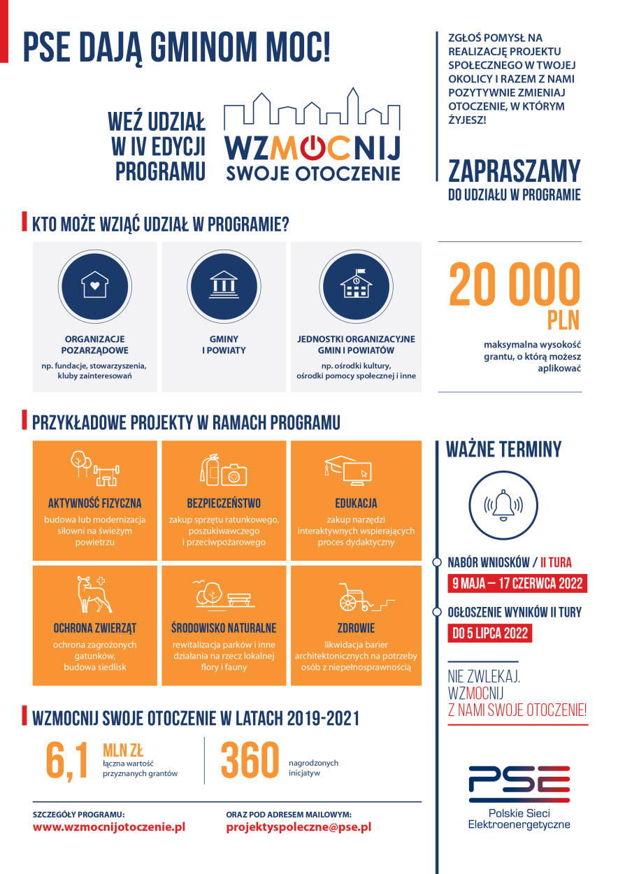 Program „WzMOCnij swoje otoczenie” wspiera projekty związane z rozwojem lokalnej infrastruktury społecznej, aktywizacją życia społecznego i kulturalnego oraz daje finansową pomoc w ich wdrożeniu. Inicjatywa jest skierowana do gmin, w których PSE prowadzą inwestycje lub eksploatują istniejącą infrastrukturę. Idea programu jest zbliżona do formuły budżetu partycypacyjnego, dzięki któremu mieszkańcy mogą aktywnie zmieniać swoją okolicę. W drugiej turze rekrutacji o granty w wysokości do 20 tys. zł mogą ubiegać się samorządy, ich jednostki budżetowe, np. szkoły, przedszkola czy ośrodki pomocy społecznej, a także organizacje pozarządowe z województwa mazowieckiego, dolnośląskiego, opolskiego, podkarpackiego, śląskiego, wielkopolskiego i zachodniopomorskiego.