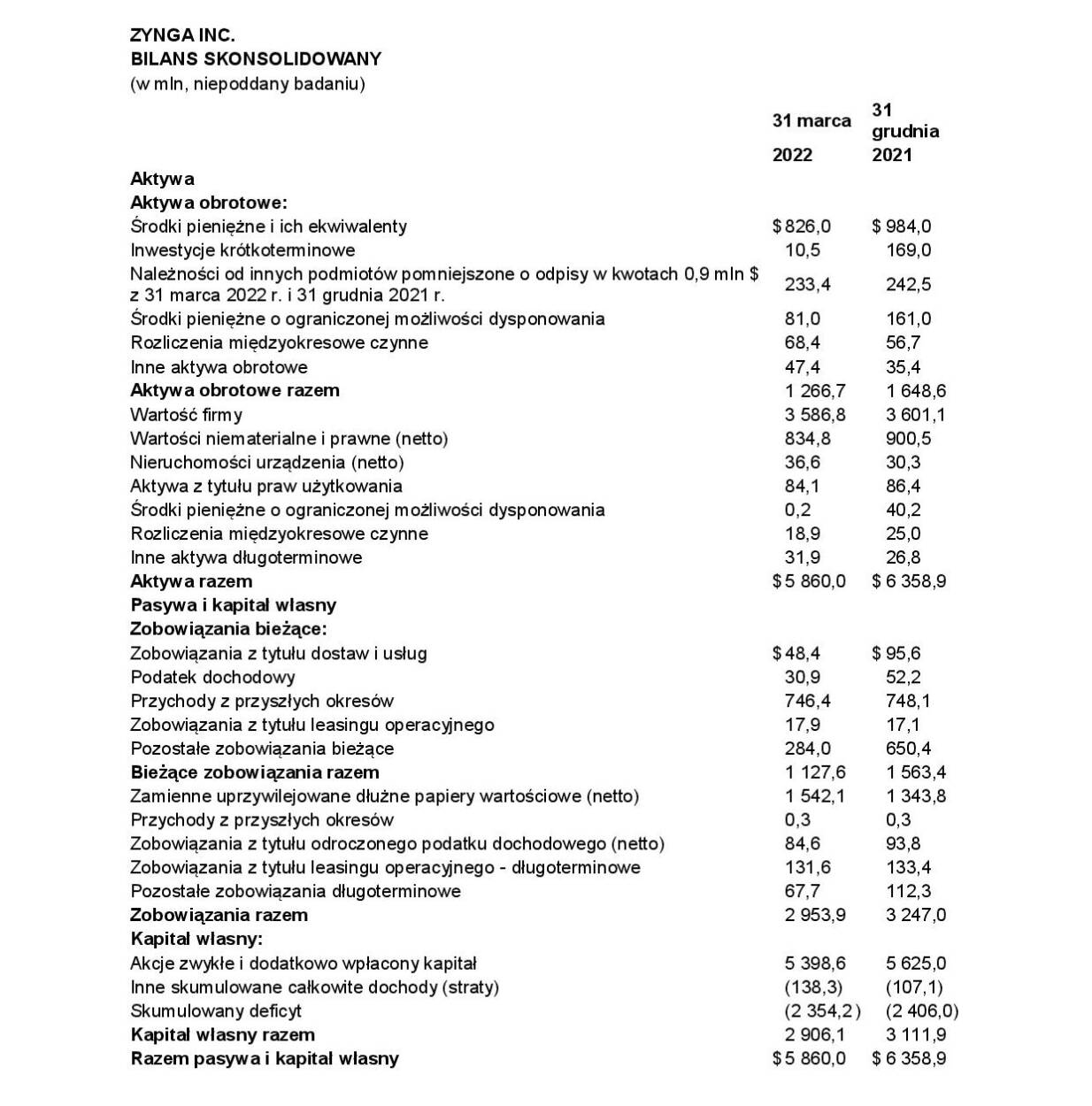 ZYNGA INC. BILANS SKONSOLIDOWANY