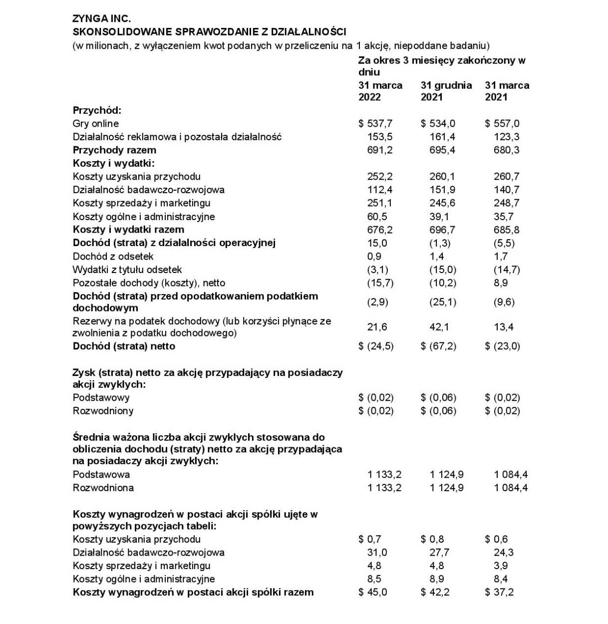 SAN FRANCISCO--(BUSINESS WIRE)— Spółka Zynga Inc. (NASDAQ: ZNGA) podała dziś swoje wyniki finansowe za pierwszy kwartał kończący się 31 marca 2022 r.