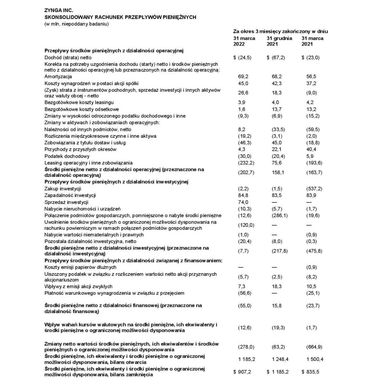 ZYNGA INC. SKONSOLIDOWANY RACHUNEK PRZEPŁYWÓW PIENIĘŻNYCH