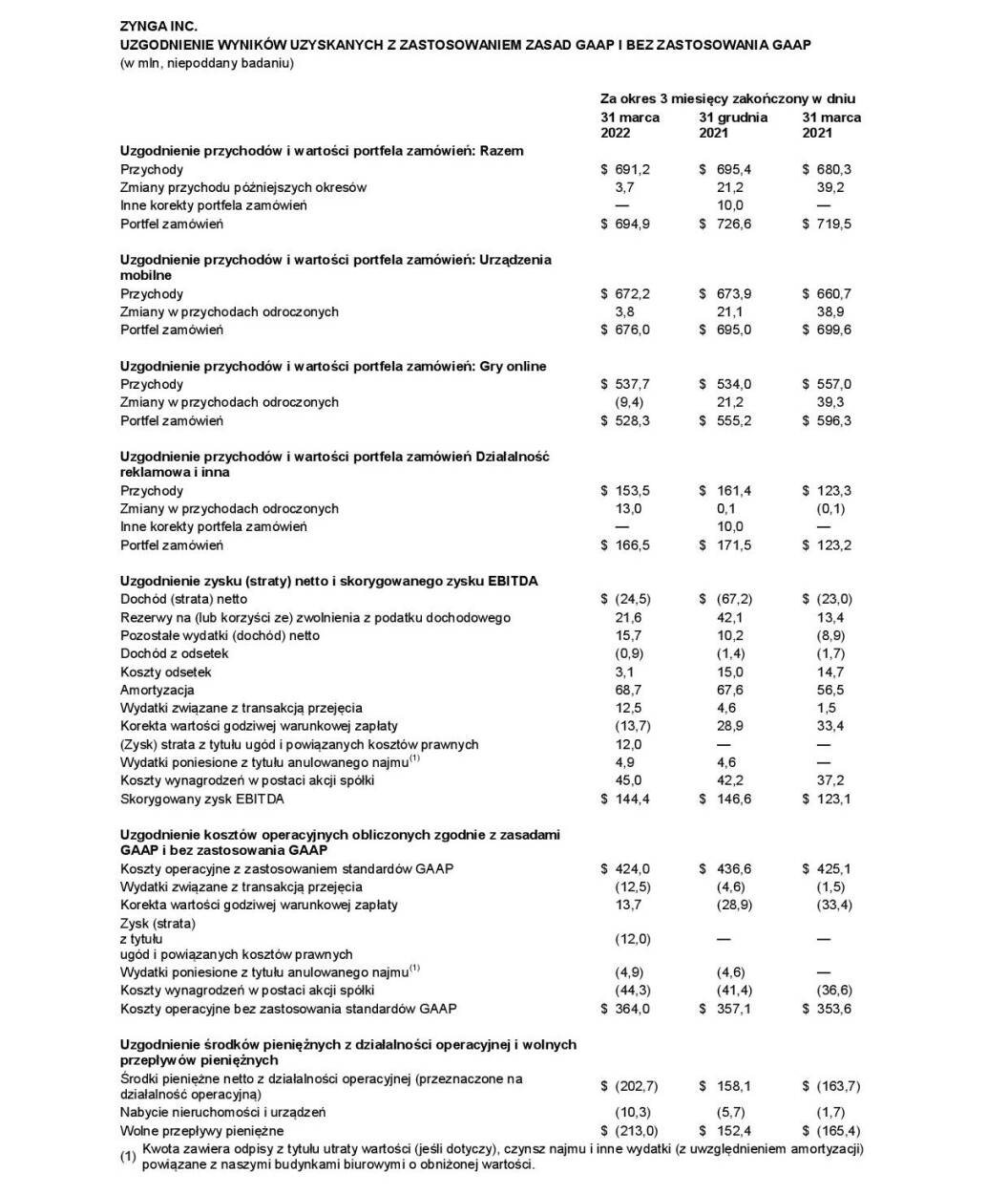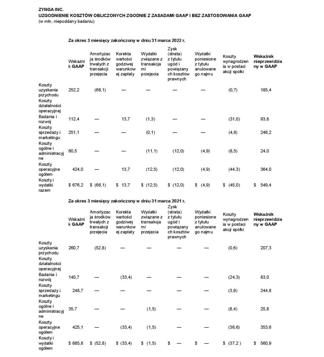 ZYNGA INC. UZGODNIENIE WYNIKÓW UZYSKANYCH Z ZASTOSOWANIEM ZASAD GAAP I BEZ ZASTOSOWANIA GAAP