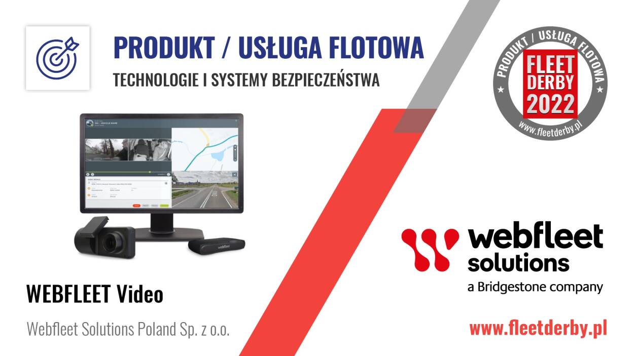Rozwiązanie Webfleet Video od Webfleet Solutions, europejskiego lidera wśród dostawców rozwiązań telematycznych i spółki z grupy Bridgestone, zwyciężyło w plebiscycie magazynu „Fleet. Auto w firmie” – Fleet Derby 2022. Produkt uzyskał największą liczbę głosów w kategorii produkt/usługa flotowa: Technologie i systemy bezpieczeństwa, zdobywając tytuł laureata i pamiątkową statuetkę.