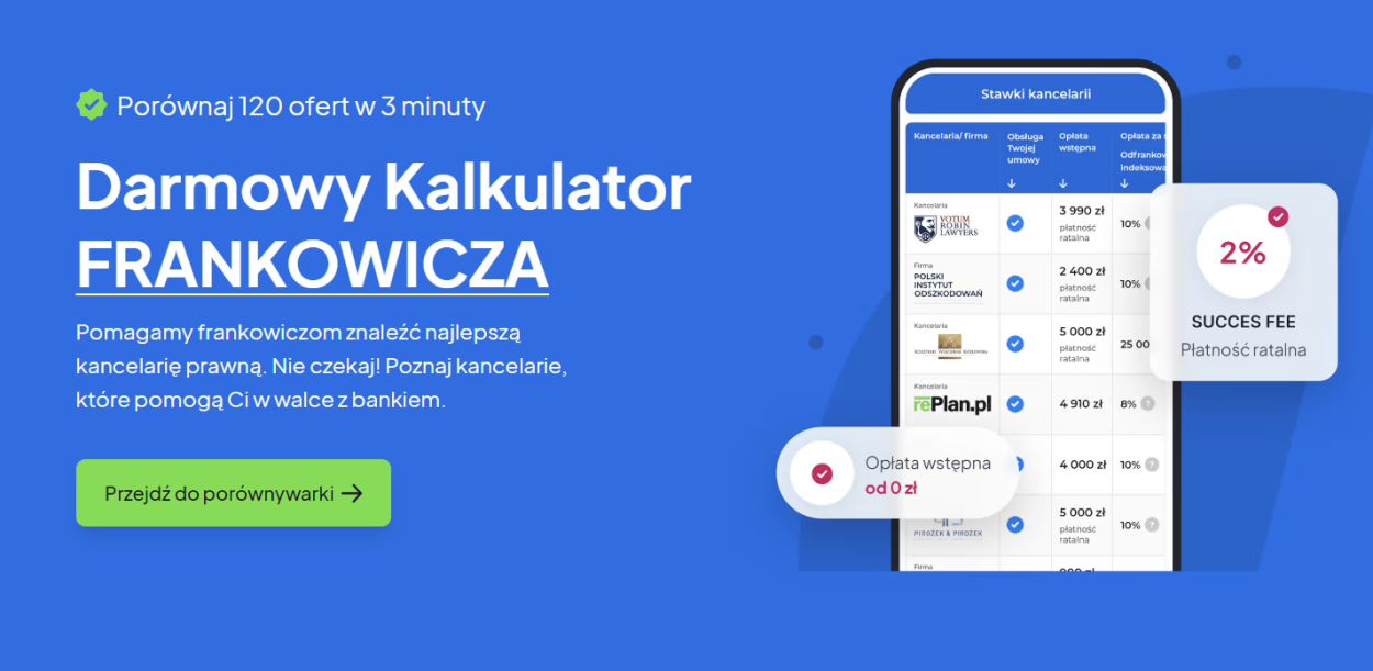 Darmowy Kalkulator Frankowicza - bo tak przedstawiany jest Frankomat - stanowi doskonałe źródło informacji dla każdego Frankowicza. Można tam znaleźć liczne oferty i porównać koszty procesu. „Nie do końca byliśmy pewni, czy jest to dla Replan odpowiednie miejsce, jednak ostatecznie się zdecydowaliśmy” - kontynuuje Agnieszka Celejowska.