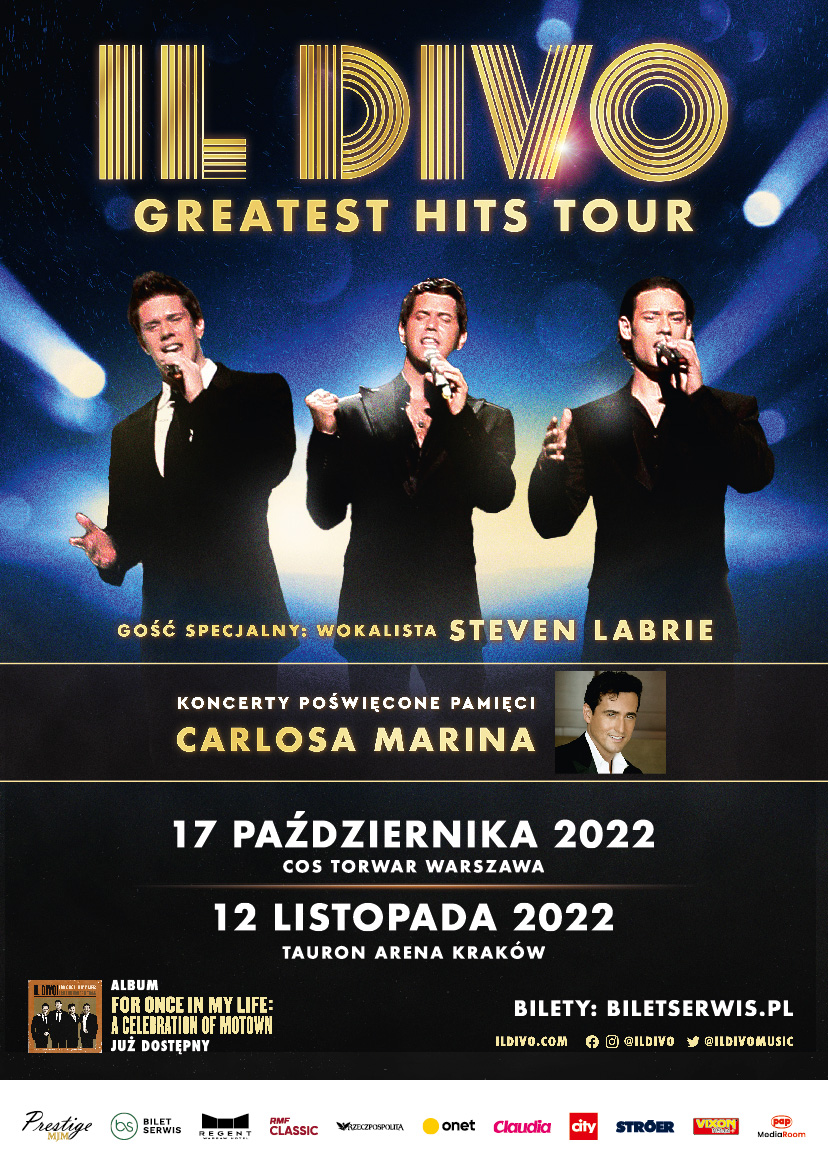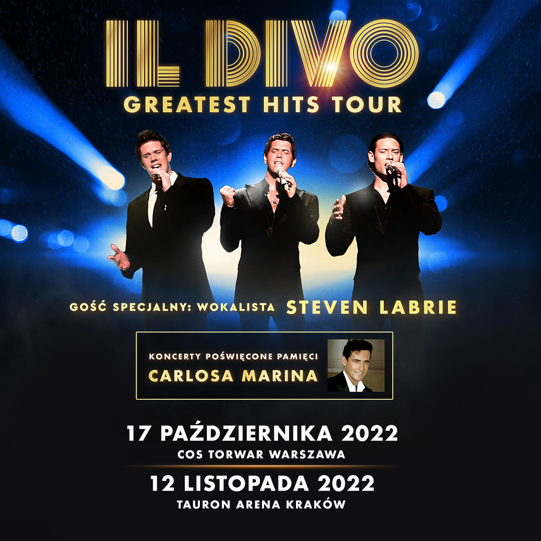Il Divo - uwielbiany zespół pop-operowy ogłasza już drugi w tym roku koncert w Polsce. Fani w naszym kraju będą mieli okazję zobaczyć swoich idoli dodatkowo 17 października w COS Torwar w Warszawie. Poza tym Il Divo wystąpi w Polsce także 12 listopada w TAURON Arenie Kraków. Będzie to siódma i ósma wizyta Il Divo nad Wisłą, jednak pierwszy raz bez Carlosa Marina, który odszedł z końcem 2021 roku. Nadchodząca trasa „Greatest Hits Tour” poświęcona zmarłemu członkowi zespołu zapowiada się jako najbardziej wzruszająca w historii Il Divo. Organizatorem koncertów jest agencja Prestige MJM.