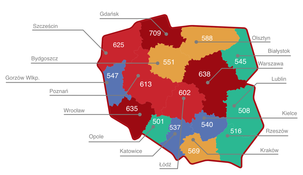 Miasta wojewódzkie wciąż pozostają statystycznie droższe o 7,5 proc. od reszty kraju (średnia: 581 zł). Na czele najdroższych miast pozostaje Gdańsk (jedyny wyraźny wzrost w dużych miastach - do poziomu 709 zł), Warszawa (638 zł, spadek) i Wrocław (635 zł, spadek).