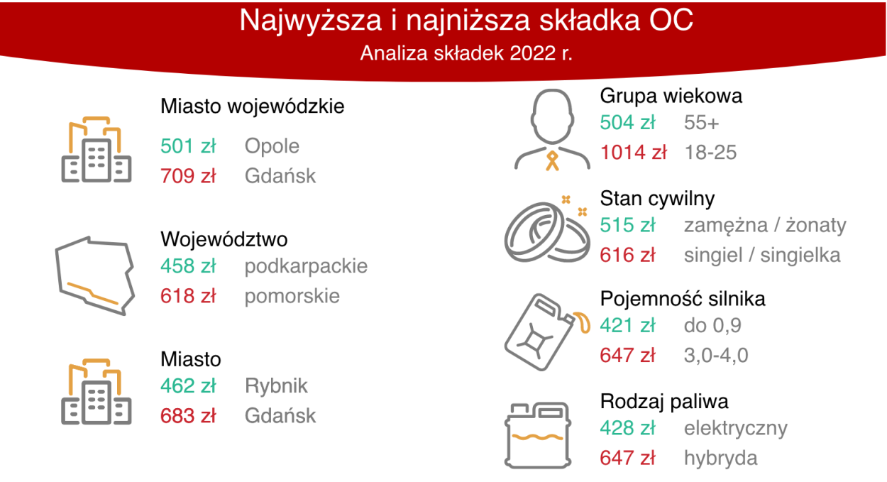 W podziale na województwa, tylko w czterech z nich przeciętnie ceny OC były droższe od średniej krajowej. W kolejności od najdroższego, statystycznie najwięcej za OC płacą kierowcy z pomorskiego, mazowieckiego i dolnośląskiego. Średnia cena w mniejszych miejscowościach tych województw również przewyższa średnią krajową!