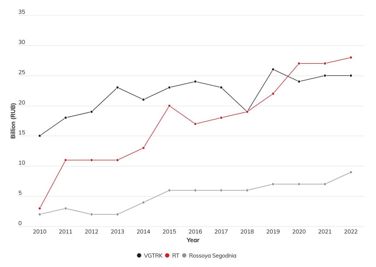 Trzy konglomeraty otrzymują ponad połowę rocznych środków przeznaczonych na rosyjskie media. Innymi odbiorcami finansowania są Pierwszy Kanał Rosyjski (Pervyi Kanal), Rosyjska Telewizja Publiczna (OTR) oraz agencja ITAR-TASS. W projekcie rosyjskiego budżetu nie przewidziano cięć w wydatkach na media państwowe. Biorąc pod uwagę gwałtowny wzrost finansowania mediów propagandowych w związku z wojną w Ukrainie można założyć, że środki przeznaczone na media masowe w Rosji znacznie przekroczą zakładane w budżecie.