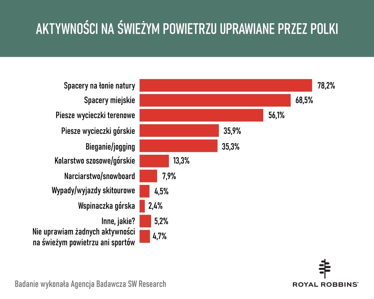 Wśród polskich respondentek największą popularność mają spacery oraz piesze wycieczki - 78,2% deklaruje, że spaceruje na łonie natury, 65,8% wybiera spacery miejskie, 56,1% spaceruje w mieście, 35,9% w górach. Dużym zainteresowaniem cieszy się również bieganie - tę formę aktywności uprawia 35,3% badanych. „Sposoby spędzania czasu na świeżym powietrzu mają odzwierciedlenie w deklarowanej zawartości koszyka. Polki doceniają ubrania sportowe dobrej jakości, które mogą wykorzystać podczas uprawiania więcej niż jednego rodzaju aktywności fizycznej. Dlatego coraz większą popularnością cieszą się produkty wielofunkcyjne, które można założyć zarówno podczas trekkingu w górach, jak i spaceru po mieście. W kolekcji Royal Robbins znajdziemy casualowe bluzy i spodnie, funkcjonalne koszule czy stylowe sukienki stworzone z materiałów do tej pory zarezerwowanych dla odzieży typowo outdoorowej. Ubrania wyprodukowane z poszanowaniem środowiska naturalnego, ale także posiadające wiele praktycznych funkcji, są więc na przykład odprowadzające pot, nieplamiące czy odporne na zagniecenia, wszystkie te właściwości doskonale sprawdzają się na szlaku, jak i w miejskich realiach, a nawet w pracy” - wyjaśnia Dorota Grzechowiak, przedstawiciel marki Royal Robbins w Polsce.