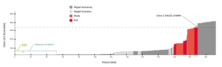 Przy dużym zużyciu energii (23116 MW) i wysokiej produkcji energii ze źródeł odnawialnych na poziomie 7395 MW cenę energii wyznaczały jednostki węglowe i wynosiła ona 780,93 zł/MWh. Gdyby przy takiej samej produkcji energii z OZE jej zużycie było takie, jak w przykładzie 2., a więc o 10 000 MW niższe, to cena energii na giełdzie kształtowałaby się na poziomie kilkunastu złotych za MWh.