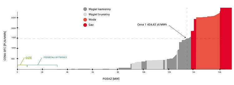 Niska produkcja energii ze źródeł odnawialnych (tylko 513 MW) przy jednoczesnym małym spowodowanym wczesną porą dnia zapotrzebowaniu na poziomie 13717 MW sprawiły, że cenę energii wyznaczały jednostki węglowe i wynosiła ona 1 454,62 zł/MWh. Tym samym cena była dwa razy niższa niż w przykładzie 1. Warto zauważyć, że zwiększenie zapotrzebowania o 1 000 MW spowodowałoby skokowy wzrost ceny do ponad 2000 zł/MWh.