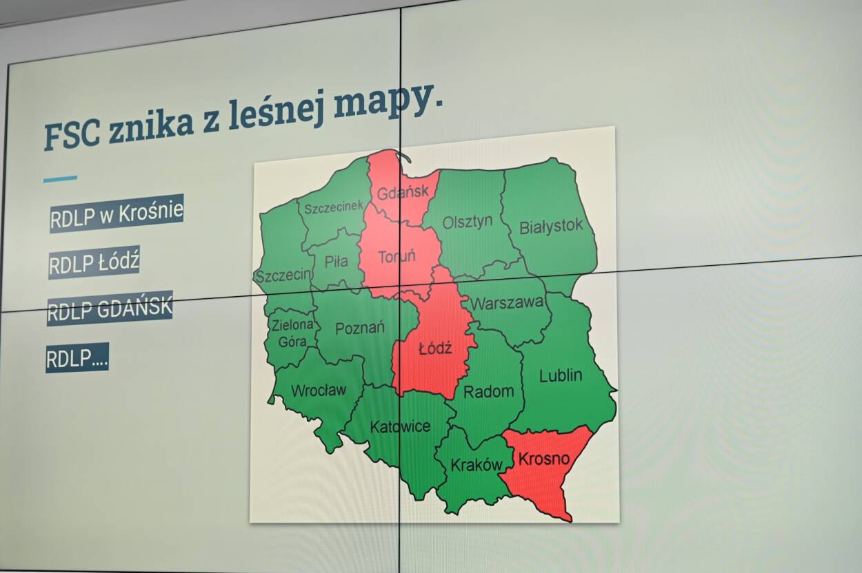 Na przestawionej przez niego mapie zaznaczono regionalne oddziały Lasów Państwowych, które nie mają certyfikatu FSC.
