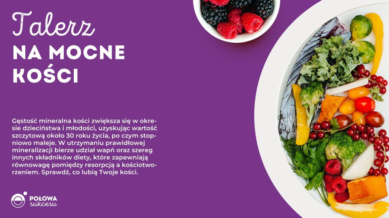 Wapń niewątpliwie pełni kluczową rolę w budowaniu i utrzymaniu mocnych kości. Najbardziej wartościowe źródła wapnia to mleko i produkty mleczne, gdyż zawarta w nich laktoza zwiększa wchłanianie wspomnianego pierwiastka. Dodatkowo produkty te charakteryzuje odpowiedni stosunek wapnia do fosforu (1:1). Z różnych przyczyn niektórzy muszą zrezygnować z nabiału, nie oznacza to jednak, że będą zmagać się z łamliwymi kośćmi czy osteoporozą. W świecie roślinnym także mamy produkty zasobne w omawiany pierwiastek. Najwięcej wapnia (w dobrym stosunku do fosforu) znajdziemy w warzywach kapustnych jak brokuł, kalafior, brukselka, jarmuż, kalarepa, biała kapusta, sałata. Na uwagę zasługują różne odmiany fasoli, groch, ciecierzyca jak również ziarna słonecznika i maku. Wchłanianie wapnia ułatwia witamina D, w naszej szerokości geograficznej zalecana jest suplementacja, natomiast warto wiedzieć, że istotnym źródłem pokarmowym witaminy D2 są grzyby uprawiane w świetle UV jak pieczarki oraz różne grzyby suszone.