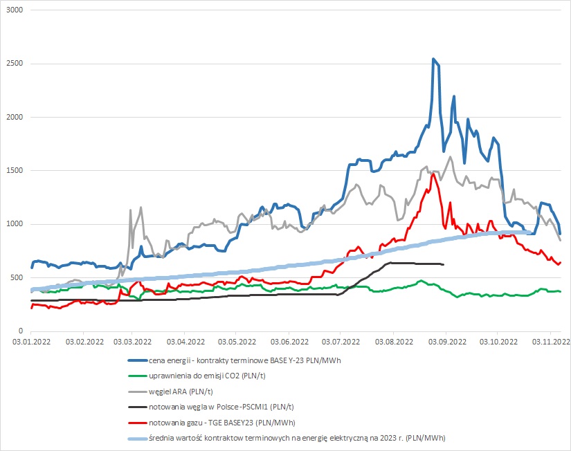 Na rynku terminowym energia jest kontraktowana z wyprzedzeniem – kilku lub kilkunastomiesięcznym, a czasem nawet dwuletnim. Również tutaj wysokość kontraktów może się bardzo różnić i jest zależna od momentu ich zawarcia. W ubiegłym roku i na początku bieżącego, przy niższych cenach surowców na rynkach terminowych (jeszcze przed rozpoczęciem rosyjskiej inwazji na Ukrainę), ceny kontraktów terminowych na 2023 rok były znacznie niższe niż w sierpniu tego roku, czyli w momencie, gdy ceny gazu były rekordowe, a niepewność na rynkach największa. Działania rządu, w tym zmiana przez ministra klimatu tzw. rozporządzenia systemowego, a także zapowiedź innych zmian na rynku energii, w tym ograniczenia wzrostu jej cen dla odbiorców końcowych, uspokoiły rynek i doprowadziły do obserwowanego obecnie spadku cen.