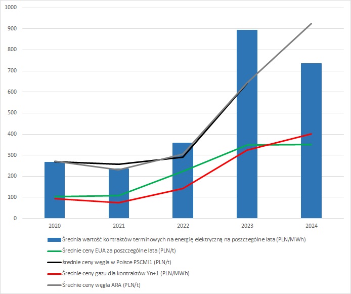 Na rzeczywiste ceny energii największy wpływ ma średnia cena, po której sprzedawcy kupują od producentów energię w kontraktach terminowych. Składają się na nią kontrakty zawierane przez wiele miesięcy, a nawet kilka lat, przy bardzo różnych parametrach cenowych, których wahania mogą dochodzić w skrajnych przypadkach nawet do kilkuset procent. Średnia cena kontraktów terminowych od dwóch lat systematycznie rośnie, co jest skorelowane z cenami surowców (węgla i gazu) oraz uprawnień do emisji dwutlenku węgla w unijnym systemie EU ETS.