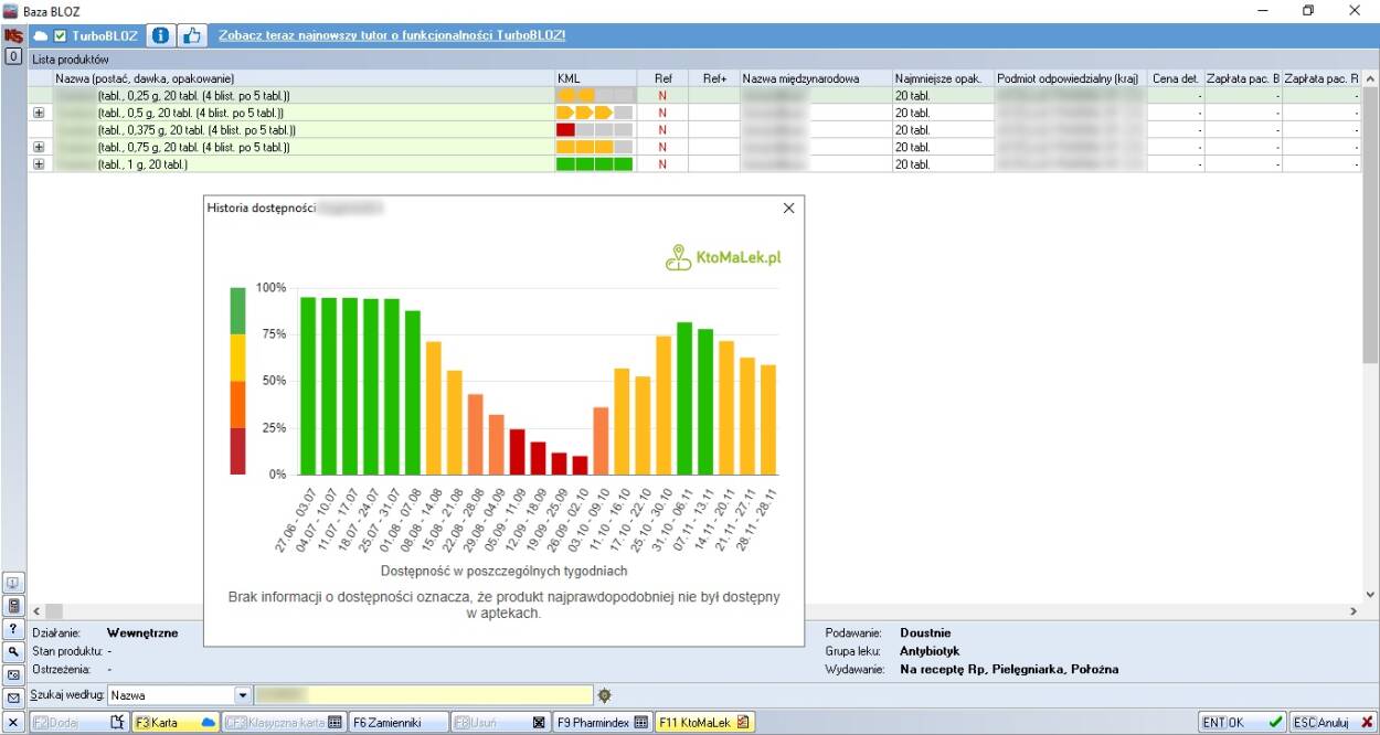 Dodatkowo lekarz widzi trendy dostępności danego leku. O wzroście dostępności danego produktu informuje symbol strzałki skierowany w prawą stronę, natomiast przy malejącej dostępności strzałka będzie skierowana w lewo. W każdym z tych przypadków lekarz może sprawdzić na wykresie szczegóły dotyczące trendów dostępności dla danego leku w określonym czasie.