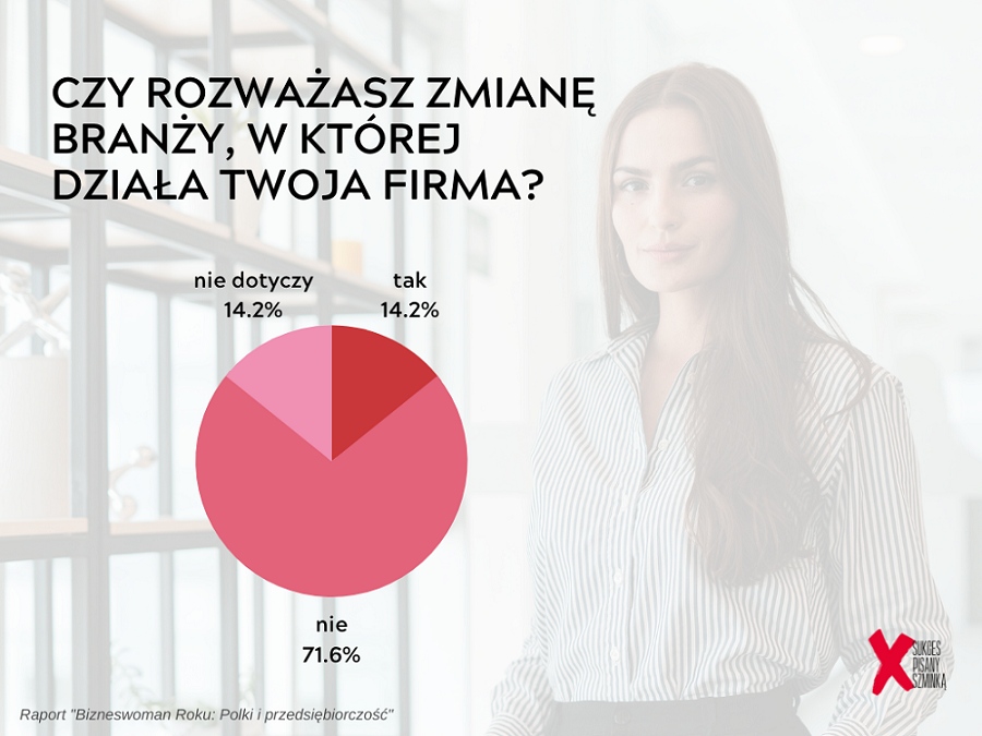 Większość polskich przedsiębiorczyń (71,7 proc.) nie bierze pod uwagę zmiany branży, w której działa ich firma – wskazują wyniki badania przeprowadzonego przy okazji 14. już edycji konkursu Sukces Pisany Szminką Bizneswoman Roku – najstarszego i największego w Polsce konkursu, w którym nagrodzono już ponad 120 zwycięzców. Przedsiębiorczynie rozważające zmianę branży stanowią 14,2 proc. ankietowanych, ponad połowa z nich wybrałaby nową, w której nie ma jeszcze doświadczenia. W planach tych, które zmianę branży biorą pod uwagę, najczęściej pojawia się sektor IT.