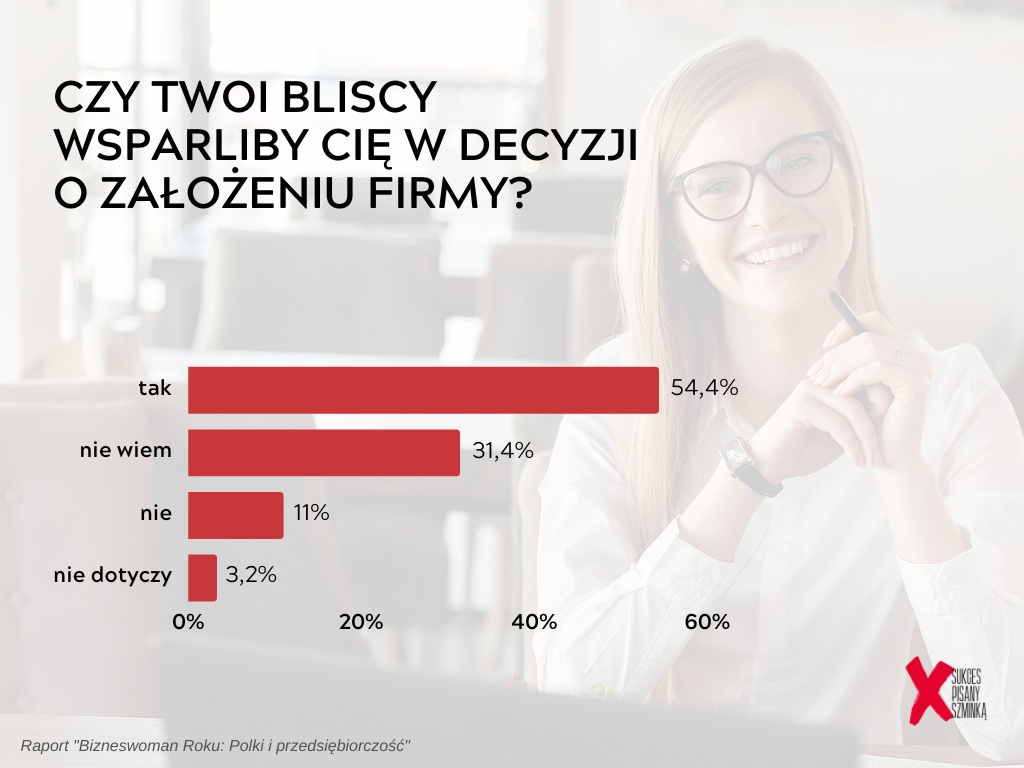 Ponad 40 proc. Polek chciałoby prowadzić własną firmę. Nastroje kobiet biznesu uległy zmianie – ubiegłoroczne badanie wskazywało, że własny biznes chciałyby mieć dwie na trzy ankietowane. Jest to więcej niż w tegorocznym badaniu. Co ważne, Polki niezmiennie czują, że bliscy wsparliby ich decyzję o założeniu firmy – jedynie 11 proc. temu jednoznacznie przeczy.