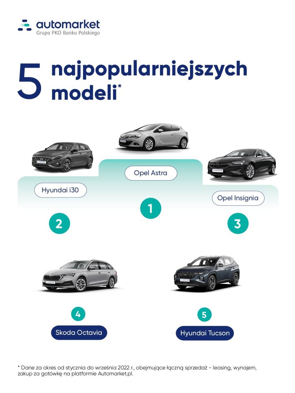 Od stycznia do września 2022 toku największy udział w łącznej sprzedaży (wynajem długoterminowy, leasing i zakup za gotówkę) w Automarket.pl miały: Opel Astra (7,3%), Hyundai i30 (5,8%), Opel Insignia (4,1%), Skoda Octavia (3,8%) i Hyundai Tucson (3,3%). Pośród 10 najpopularniejszych aut najwięcej było kompaktów z segmentu C i aut miejskich z segmentu B.