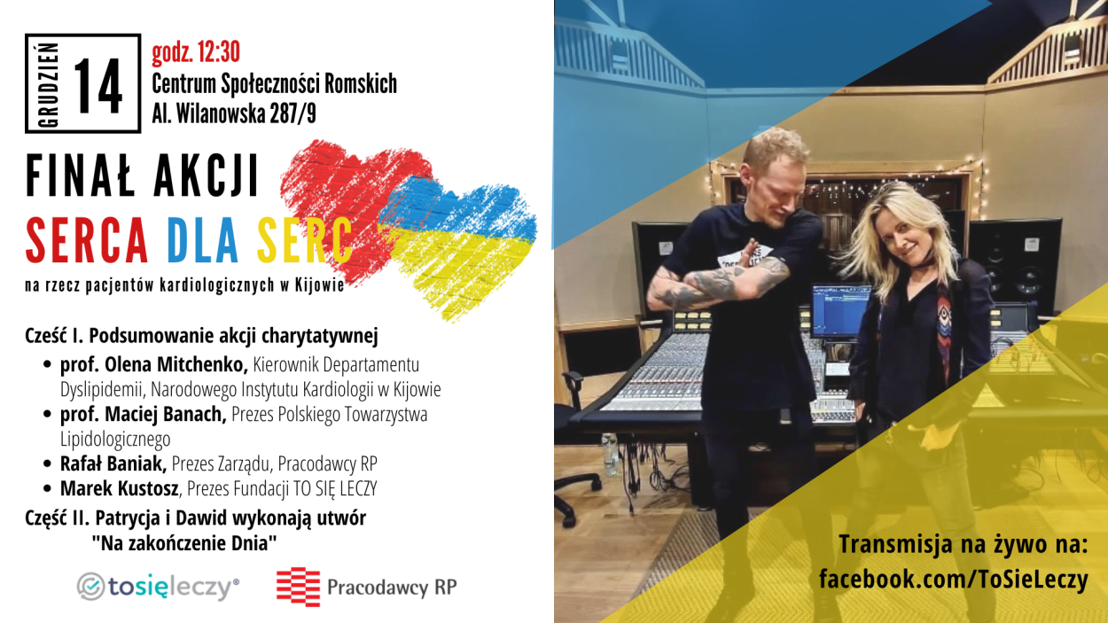 W wyniku przedłużających się działań wojennych w Ukrainie, coraz trudniej jest zapewnić ciągłą opiekę medyczną i pomoc wszystkim potrzebującym pacjentom. Jedną z grup, która wymaga ciągłego monitorowania oraz natychmiastowej interwencji w nagłych sytuacjach są osoby z chorobami sercowo-naczyniowymi. To dla nich na wiosnę, z inicjatywy prof. Macieja Banacha, prezesa Polskiego Towarzystwa Lipidologicznego oraz Fundacji TO SIĘ LECZY, zorganizowano zbiórkę charytatywną „Serca dla Serc” na zakup sprzętu medycznego, w ramach której zebrano ponad 100000 zł. Środki przeznaczono na zakup sprzętu kardiologicznego, pozwalającego na monitorowanie stanu zdrowia pacjentów Instytutu Kardiologii w Kijowie m.in. systemy 24-godzinnego monitorowania, Holtery EKG, ambulatoryjne systemy monitorowania ciśnienia krwi, rejestratory i rękawy.