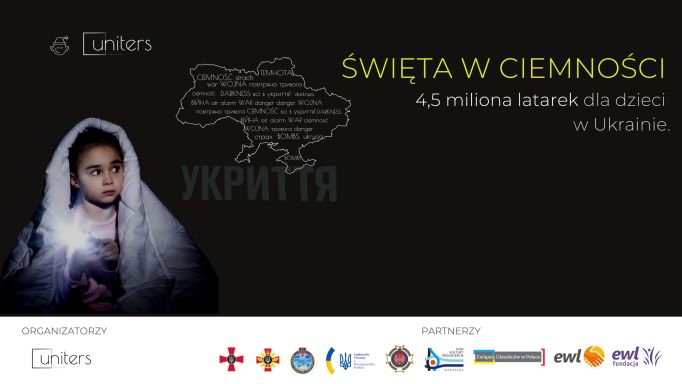 4,5 miliona dzieci w Ukrainie może spędzić święta w ciemności, gdyż w wyniku wojny wiele miejscowości jest odciętych od prądu. Dlatego Fundacja UNITERS organizuje akcję „Święta bez taty” i zbiera środki finansowe na zakup latarek, jak i same latarki wraz z bateriami, by podarować je ukraińskim dzieciom.