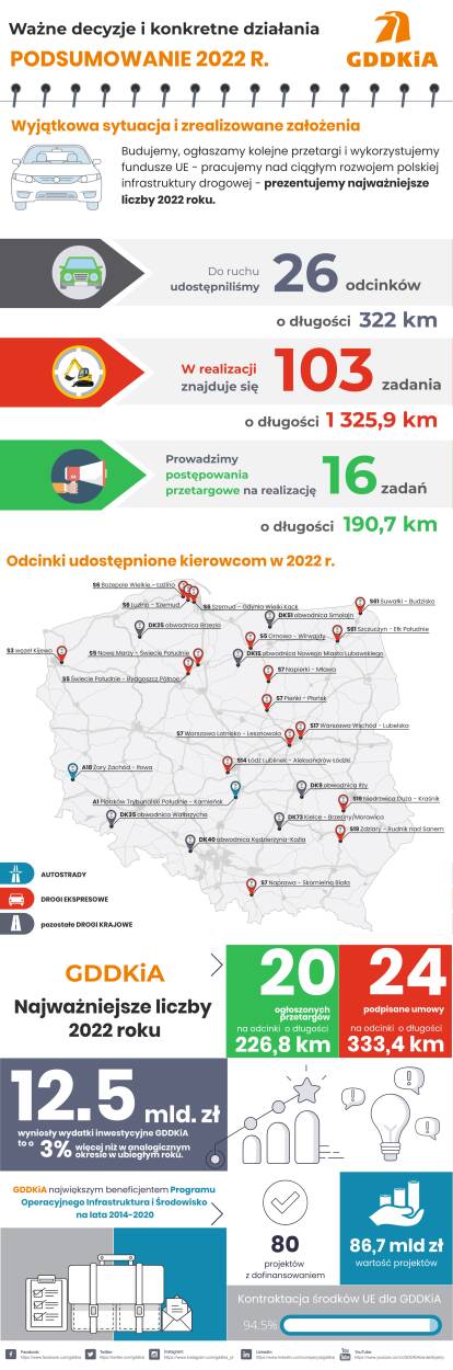 • Budujemy, ogłaszamy kolejne przetargi i wykorzystujemy fundusze UE - pracujemy nad ciągłym rozwojem polskiej infrastruktury drogowej - prezentujemy najważniejsze liczby 2022 roku.