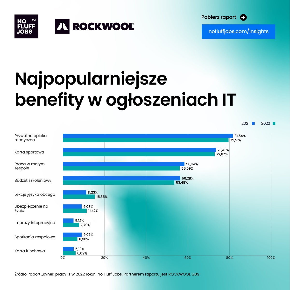 Prywatna opieka medyczna to najczęściej występujący benefit w ogłoszeniach o pracę w IT. W 2022 roku pojawił się w 80 proc. ofert i od trzech lat jest niedościgniony w tej kategorii. Karty sportowe (abonamentowe), ułatwiające zapisy na zajęcia związane z aktywnością fizyczną, to drugi popularny benefit w IT, który pojawił się w minionym roku w 73 proc. ofert. Co ciekawe, w ciągu roku największy wzrost występowania w porównaniu z 2021 rokiem zanotowały lekcje języka obcego (wzrost udziału z 11 do 15 proc.), ubezpieczenie na życie (z 9 do 11 proc.), imprezy integracyjne (z 5 do 8 proc.) i karta lunchowa (z 5 do 6 proc.).