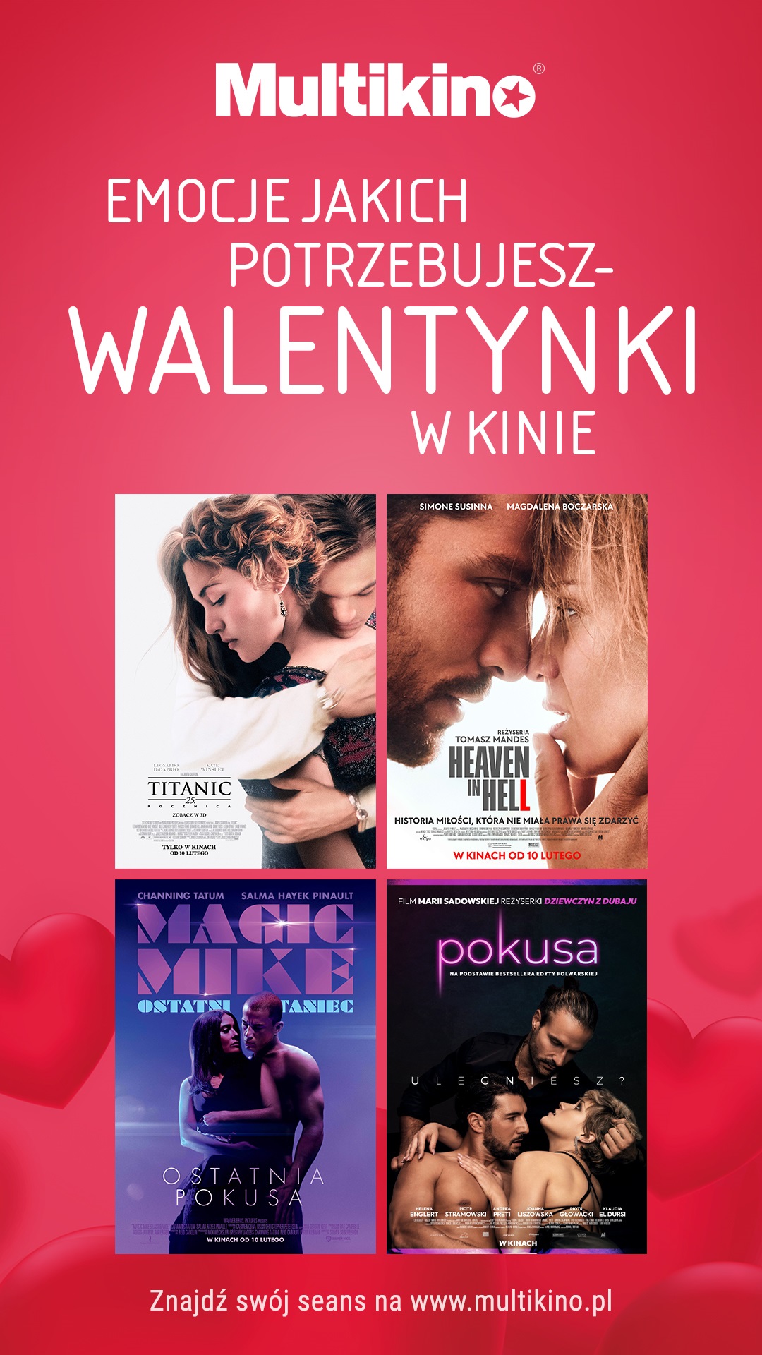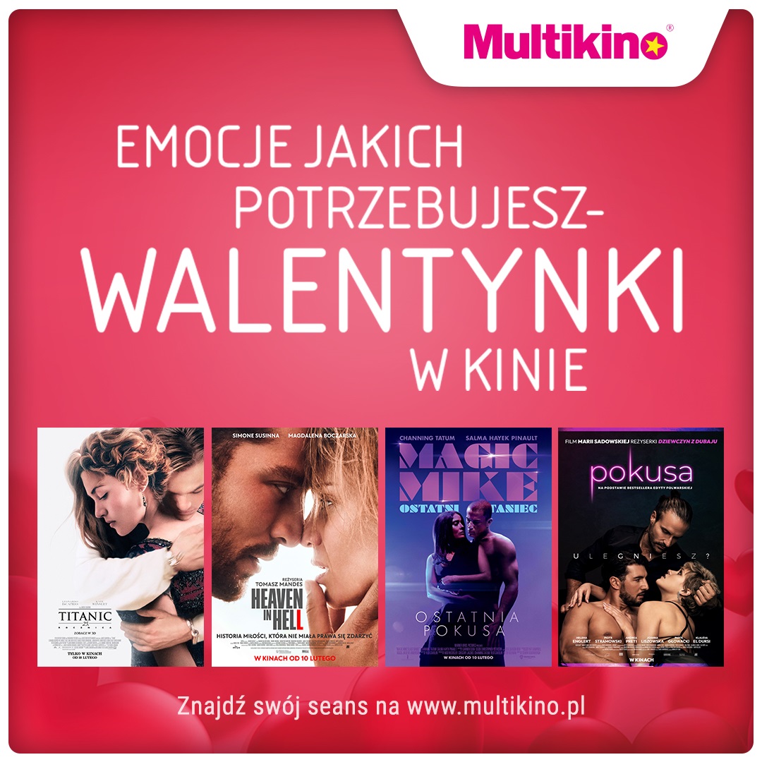 Jeśli randka, to w kinie. Jeśli kino, to Multikino! W walentynkowy weekend oraz w walentynki w Multikinie widzowie będą mogli zobaczyć między innymi: „Heaven in Hell” z Magdaleną Boczarską i Simone Susinna, film „Magic Mike: Ostatni taniec” oraz thriller erotyczny „Pokusa” z Piotrem Stramowskim, Heleną Englert i Piotrem Głowackim. Ponadto 10 lutego z okazji 25. rocznicy premiery filmu „Titanic” produkcja Jamesa Camerona powraca na kinowe ekrany w 3D. Bilety już są dostępne w kasach kin sieci Multikino, na www.multikino.pl oraz w aplikacji mobilnej.