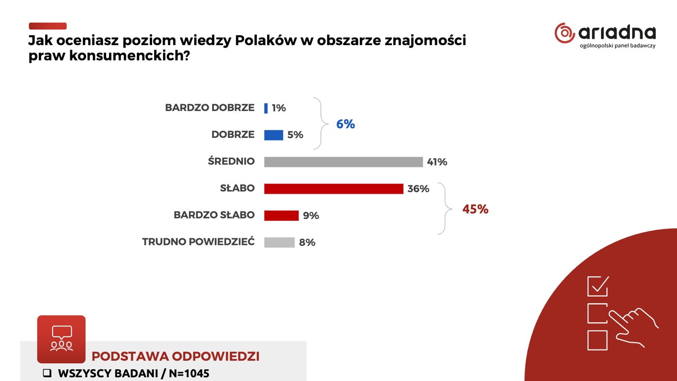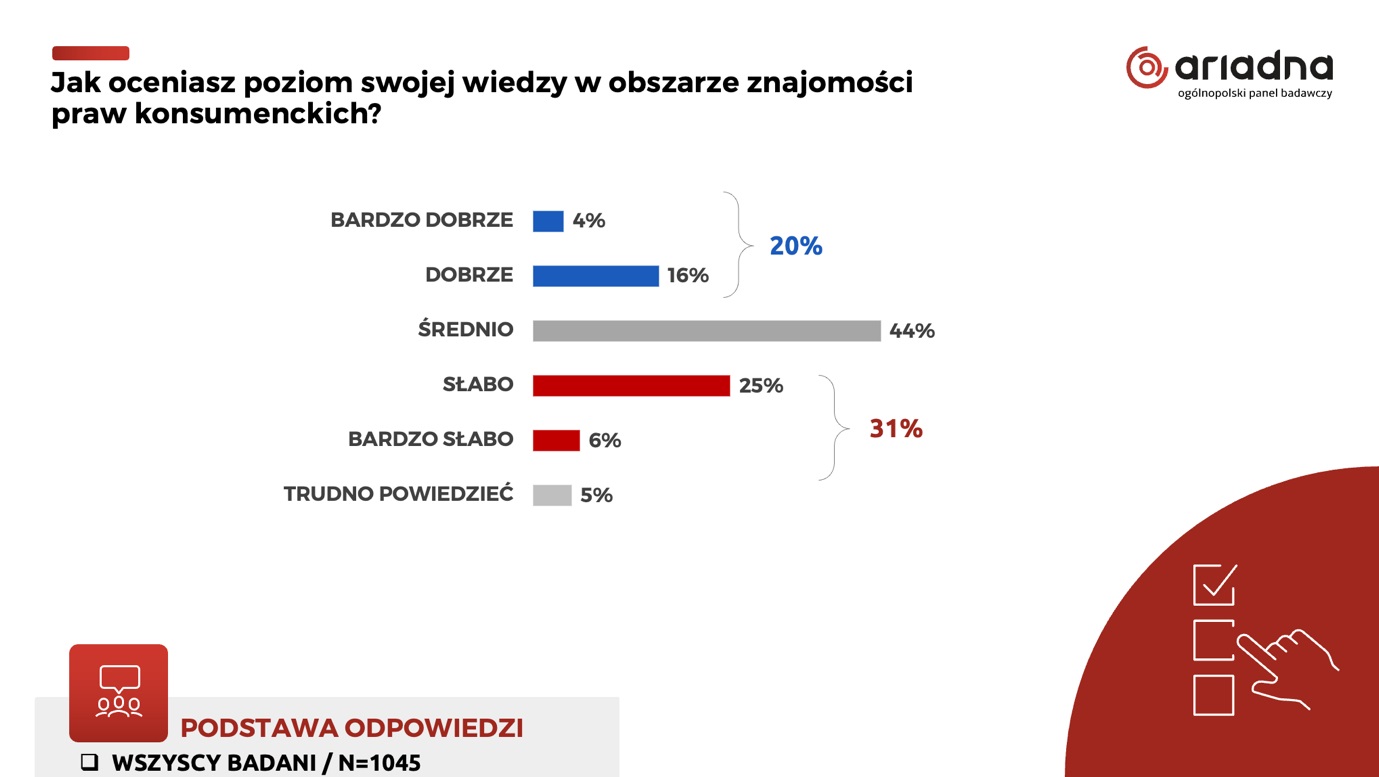 Jak wynika z badania, 20% Polaków pozytywnie ocenia swoją wiedzę w zakresie praw konsumenckich. Jednak poziom wiedzy w społeczeństwie oceniają niżej. Zdaniem badanych tylko 6% Polaków posiada wiedzę z zakresu praw konsumenckich.