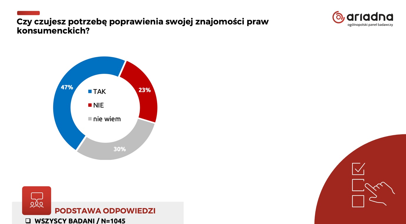 Tylko 20% respondentów pozytywnie ocenia swój poziom znajomości praw konsumenckich, a jednocześnie niemal połowa respondentów (47%) czuje potrzebę uzupełnienia wiedzy w tym zakresie. Aż 45% badanych uważa, że wiedza Polaków w obszarze znajomości praw konsumenckich jest słaba.