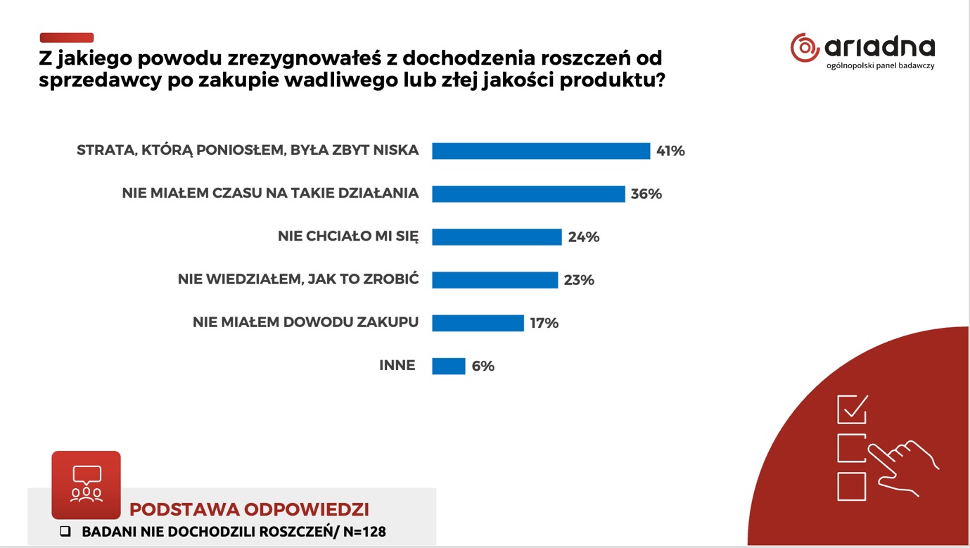 Należy również wskazać, że 64% badanych w przypadku zakupu wadliwego lub złej jakości produktu (a w przypadku oszustwa podczas zakupów online, aż 71%) zdecydowało się na dochodzenie roszczeń od sprzedawcy, korzystając tym samym z przysługujących im praw konsumenckich, w tym m.in. prawa do reklamacji. Głównymi powodami, dla których respondenci nie zdecydowali się na podjęcie działań, było poniesienie zbyt niskiej straty, brak czasu na takie działania, niechęć, brak wiedzy lub brak dowodu zakupu.