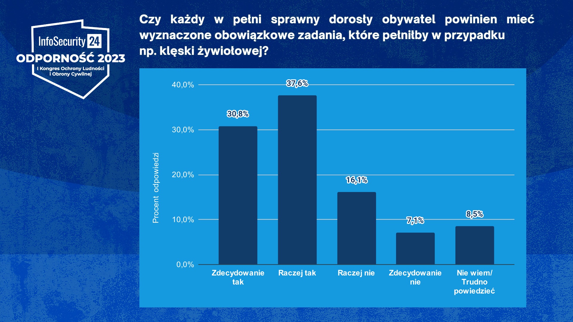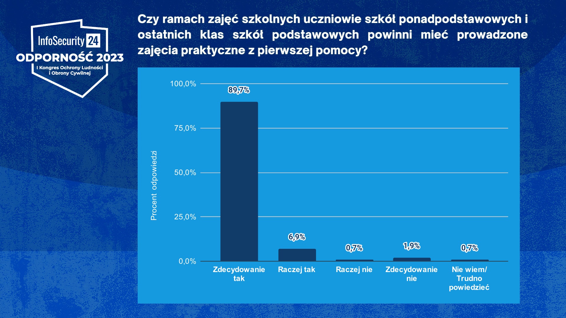 IBRiS przeprowadził dla InfoSecurity24.pl badanie, w którym Polacy pytani byli o szeroko pojęte bezpieczeństwo, m.in. o to, czy wiedzą, gdzie w pobliżu ich miejsca zamieszkania znajduje się schron, czy powinni mieć wyznaczone obowiązkowe zadania, które pełniłby w przypadku, np. klęski żywiołowej lub czy w szkołach niezbędne są zajęcia z pierwszej pomocy. Wyniki raportu były tematem odbywającego się dzisiaj w hotelu Sofitel Victoria w Warszawie kongresu - ODPORNOSĆ I Kongres Ochrony Ludności i Obrony Cywilnej.