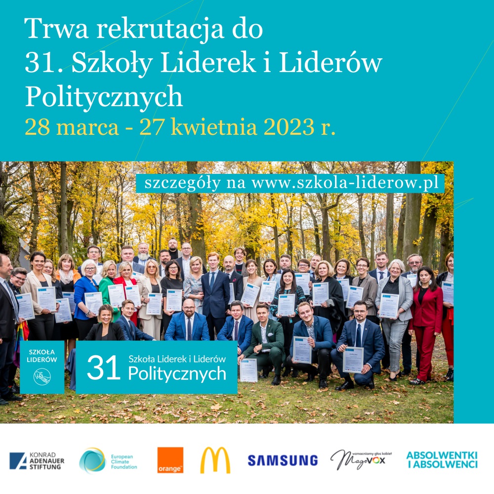 Jeśli znasz kogoś, kto mógłby skorzystać z programu lub sam/a interesujesz się przywództwem politycznym, możesz zapoznać się z kryteriami rekrutacji i składania aplikacji na stronie internetowej: https://www.szkola-liderow.pl/rekrutacja-do-31-szkoly-liderow-politycznych.