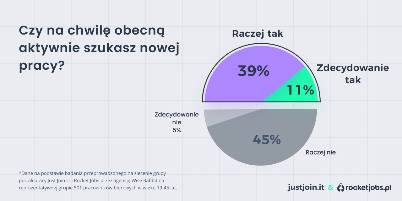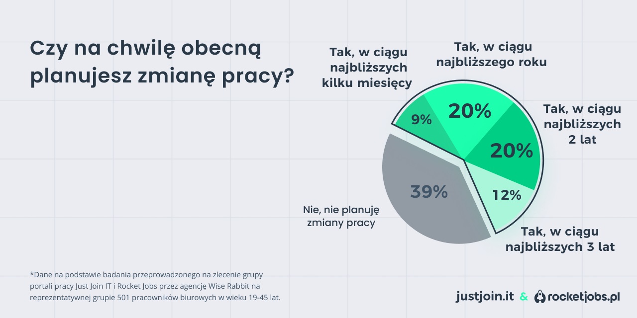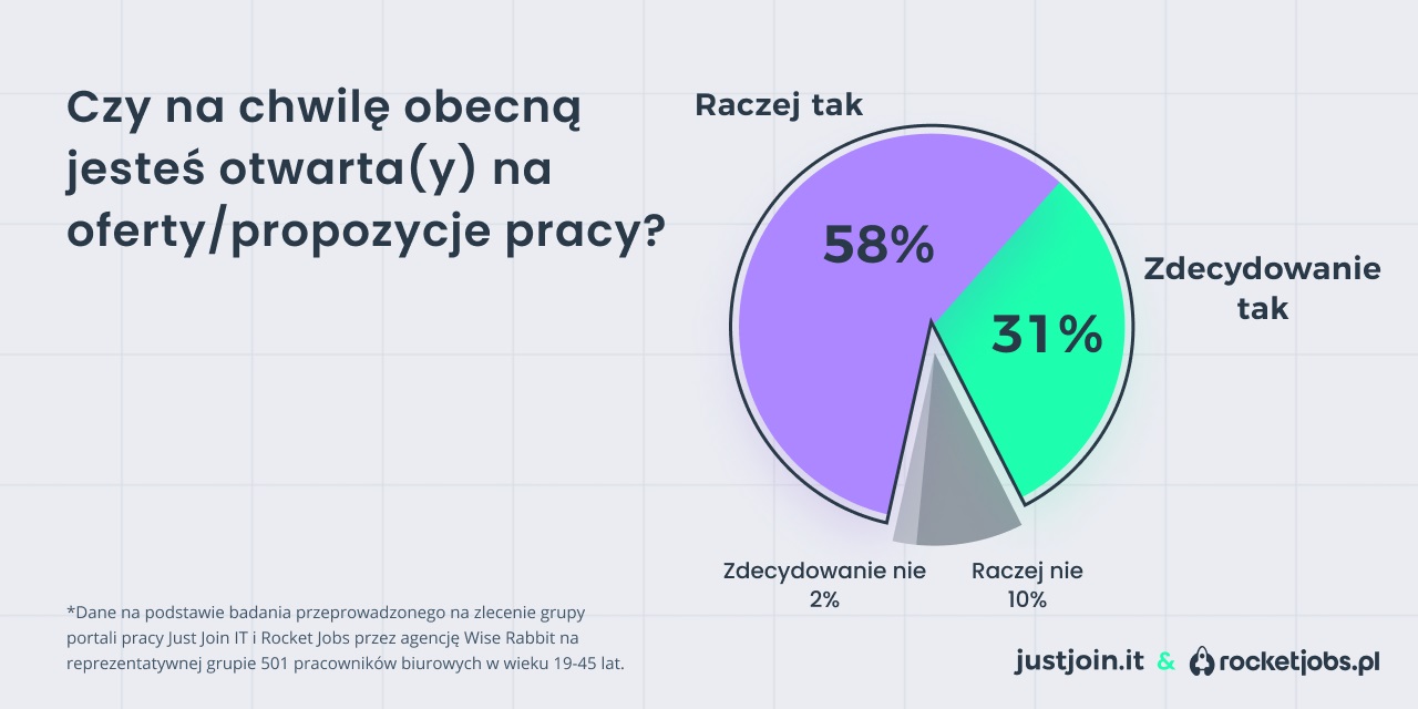 Ponad połowa pracowników polskiego segmentu white collar chce zmienić pracę w ciągu najbliższego roku i aktywnie szuka nowego pracodawcy. 9 na 10 wyraża otwartość na zmianę - wynika z badania przeprowadzonego przez Wise Rabbit dla grupy portali pracy Just Join IT i Rocket Jobs.