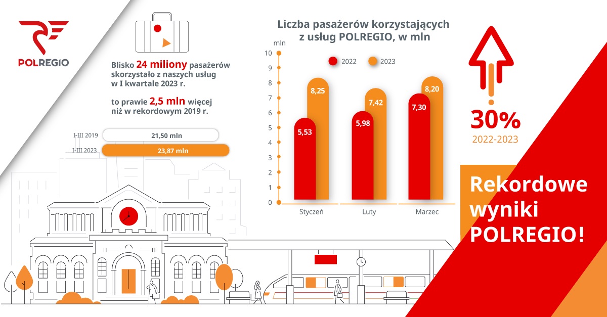 Pasażerowie doceniają oferty POLREGIO, dzięki którym liczba podróżnych sukcesywnie rośnie, a spółka ma za sobą rekordowo dobry kwartał. W pierwszych trzech miesiącach tego roku z usług przewoźnika skorzystały blisko 24 miliony pasażerów. To wzrost o prawie 30% w porównaniu do analogicznego okresu z ubiegłego roku. Najlepsze wyniki odnotowano w styczniu, kiedy to pociągami POLREGIO podróżowało ponad 8 milionów osób wobec 5,5 mln pasażerów w styczniu 2022, co oznacza 50% wzrost. Co szczególnie ważne – pobite zostały także wyniki z 2019 roku, czyli sprzed pandemii. W styczniu spółka osiągnęła lepszy o 15% rezultat w porównaniu do stycznia 2019, który był do tej pory rokiem rekordowym dla całej kolei. Tendencja rosnąca jest utrzymana także w lutym i marcu. W planach POLREGIO jest kontynuowanie tego trendu i przekroczenie w tym roku liczby 100 mln pasażerów.