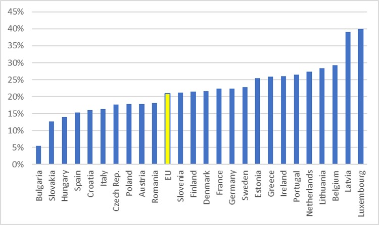 W 2021 r. tylko co czwarty projektant pracujący w UE był kobietą (24%). Istnieją znaczne różnice tego odsetka pomiędzy państwami członkowskimi UE - od 17% projektantek w Holandii, 18% na Węgrzech i Słowacji do 33% na Łotwie.