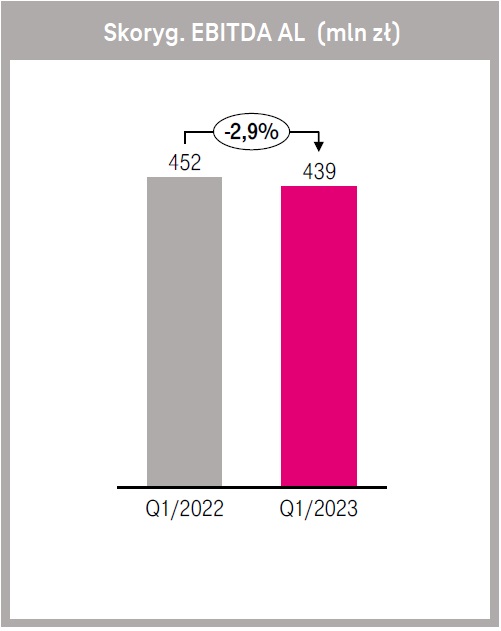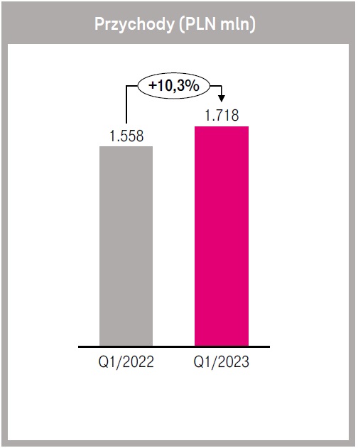 W pierwszym kwartale 2023 roku T‑Mobile Polska osiągnął znaczący wzrost przychodów całkowitych oraz przychodów z usług mobilnych. Pomimo obniżenia przychodów z połączeń międzyoperatorskich, całkowite przychody wyniosły 1,72 mld zł i wzrosły o 10,3% rok do roku. W tym samym czasie przychody z usług mobilnych osiągnęły poziom 1,01 mld zł, co oznacza wzrost o 1,1% (r/r). Z kolei bardzo znaczący wzrost kosztów w środowisku wysokiej inflacji (ze szczególnym uwzględnieniem wzrostu kosztów energii +170%) obniżył wynik EBITDA AL o -2,9% (r/r) do poziomu 439 mln zł. Na wzrost przychodów firmy wyraźny wpływ miała sprzedaż urządzeń.