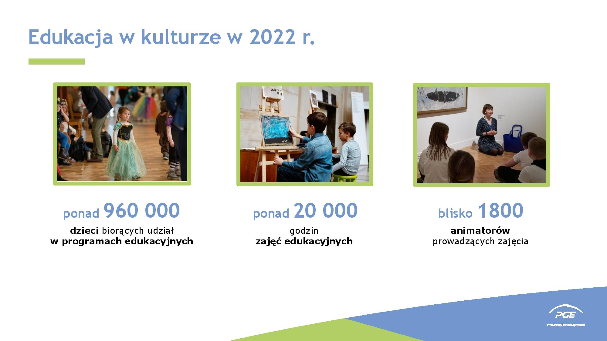 Muzea i instytucje muzyczne wspierane przez PGE oprócz regularnej działalności prowadzą liczne działania edukacyjne, w tym lekcje skierowane do uczniów szkół podstawowych i ponadpodstawowych czy warsztaty dla najmłodszych. Tylko w 2022 roku w instytucjach kultury wspieranych przez PGE zostało zorganizowanych ponad 6 tys. pojedynczych wydarzeń, w których wzięło udział blisko 6 mln osób. Dodatkowo, w muzealnych programach edukacyjnych, wspieranych przez PGE, wzięło udział ponad 960 tys. dzieci. Oznacza to, że co czwarty uczeń w Polsce wziął udział w zajęciach z dziedziny kultury, które zostały zrealizowane ze wsparciem PGE.