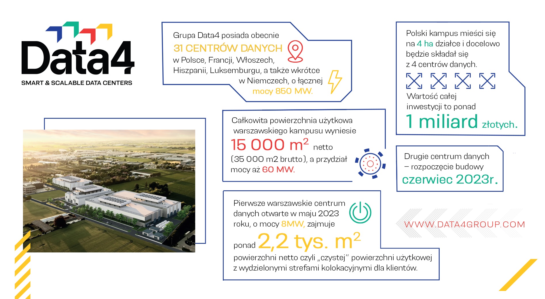 Intensywna cyfryzacja wielu dziedzin życia stale podnosi znaczenie centrów danych, które stanowią dziś fundament cyfrowej gospodarki i są częścią infrastruktury krytycznej. Data4 projektuje, buduje i obsługuje obecnie 31 wysoce skomunikowane, bezpieczne i zrównoważone pod względem środowiskowym centra danych, które wspierają rozwój klientów w różnych częściach Europy. Grupa, obecna poza Polską także we Francji, Włoszech, Hiszpanii, Luksemburgu, a wkrótce także w Niemczech, wciąż posiada znaczne rezerwy gruntów i mocy. Te możliwości zostaną rozszerzone o kolejne centra danych pod Warszawą. Przygotowania do budowy kolejnego z etapów kampusu w Jawczycach już ruszyły.