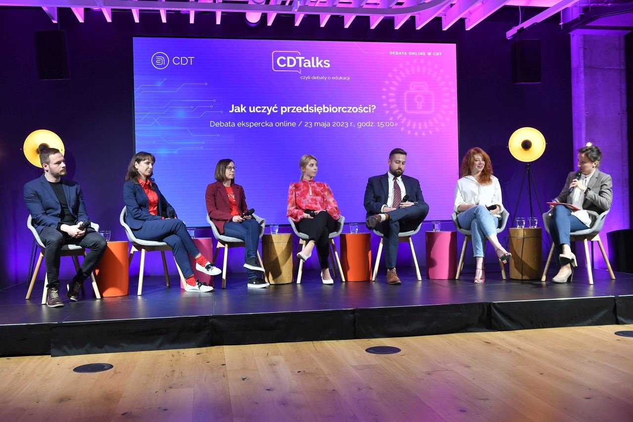 Tym razem ekspertki oraz eksperci zgromadzeni w CDT rozmawiali o tym, „Jak uczyć przedsiębiorczości”. W debacie wzięły udział Magdalena Honkowicz, Agnieszka Pierwocha i Marta Czyrkiewicz, czyli autorki najlepszych i wyróżnionych scenariuszy lekcji o przedsiębiorczości w 4. edycji konkursu “Edukacja Jutra”, a także Mateusz Rafał, dyrektor Centrum Transformacji Cyfrowej w Ministerstwie Edukacji i Nauki, Agata Białkowska-Samul, Employer Branding Senior Specialist w Allegro i zachęcał Zbigniew Bujak, trener i edukator CDT, juror w konkursie “Edukacja Jutra”.