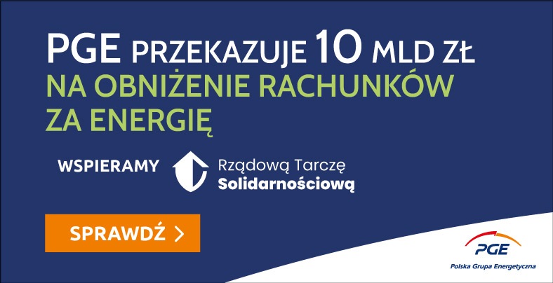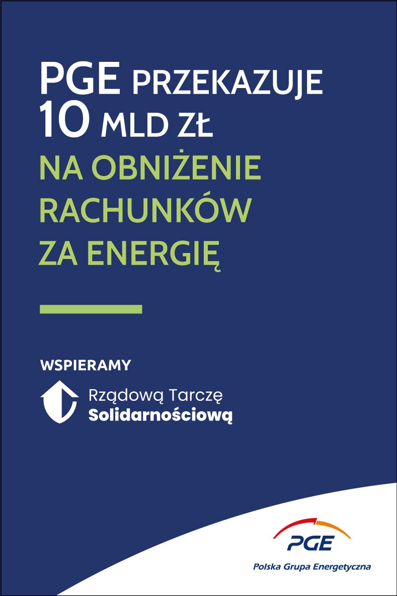 PGE Polska Grupa Energetyczna prowadzi kampanię informacyjną, w której informuje, że w ramach wsparcia Rządowej Tarczy Solidarnościowej w 2023 roku przekaże łącznie 10 mld zł. Dzięki PGE w 2023 roku polskie rodziny zapłacą za prąd nawet 3000 złotych mniej.