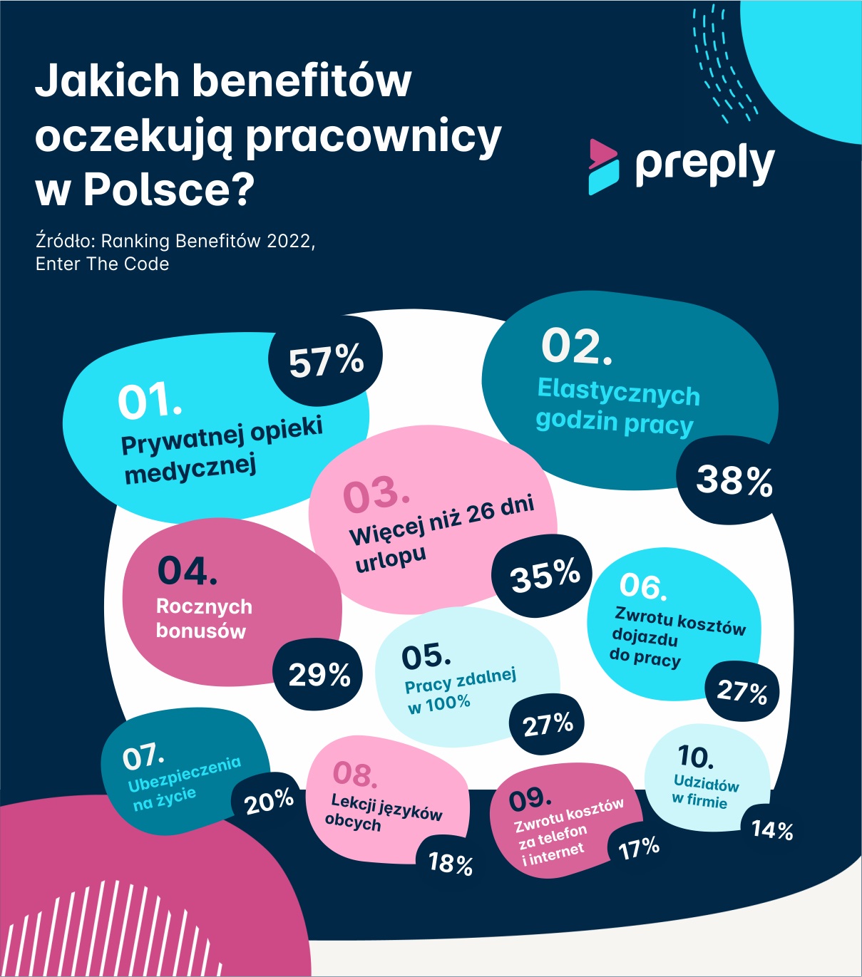 Według danych Sedlak & Sedlak polskie firmy najczęściej oferują swoim pracownikom szkolenia zawodowe i świadczenia medyczne, a najrzadziej - przyznają akcje przedsiębiorstwa i dopłaty do przedszkoli i żłobków. A czego oczekują pracownicy? Zgodnie z raportem Enter The Code, pierwsza trójka na liście najbardziej pożądanych benefitów to: prywatna opieka medyczna (57% badanych), elastyczne godziny pracy (38% badanych) i dodatkowy płatny urlop (35% badanych).