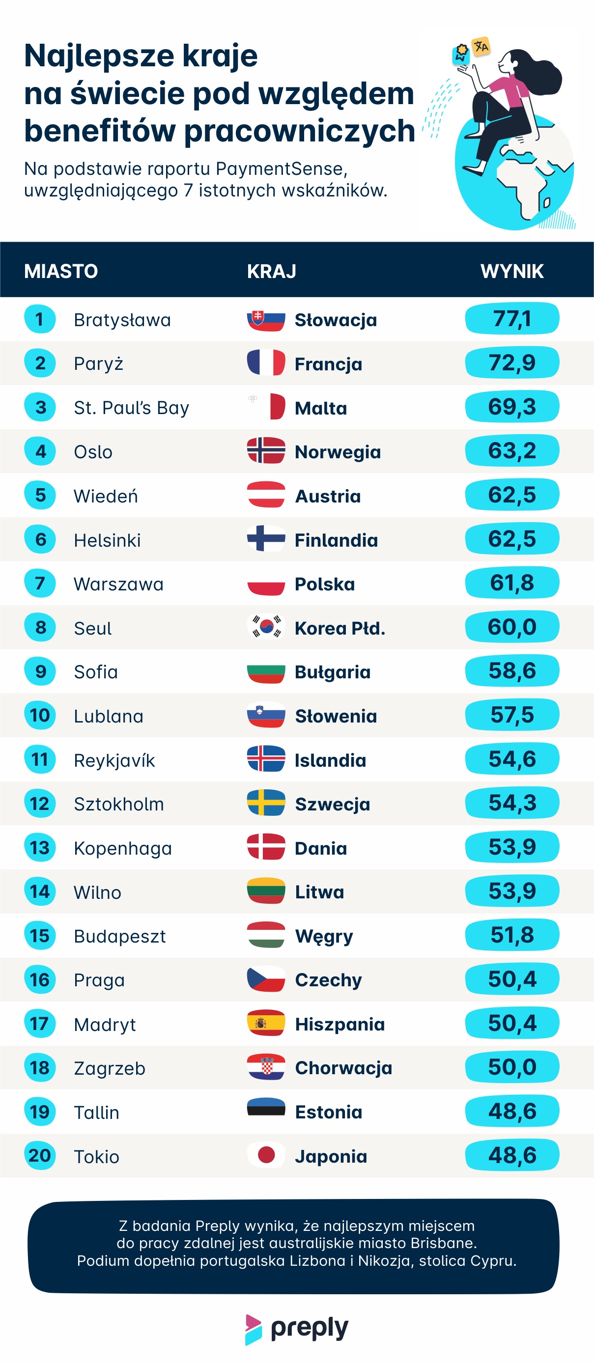 Według danych Remote najlepiej pod kątem benefitów pracowniczych w Europie wypadają kolejno Luksemburg, Hiszpania i Norwegia, a zaraz za podium plasują się Niemcy, Francja i Polska. Wiele bonusów, które cieszą się popularnością w krajach Europy Zachodniej i Północnej, na naszym rynku pracy jest rzadkością. Przykładowo Francuzi mocno cenią dopłaty do zdrowych posiłków i wsparcie zdrowia psychicznego, a Islandczycy - 4-dniowy tydzień pracy.